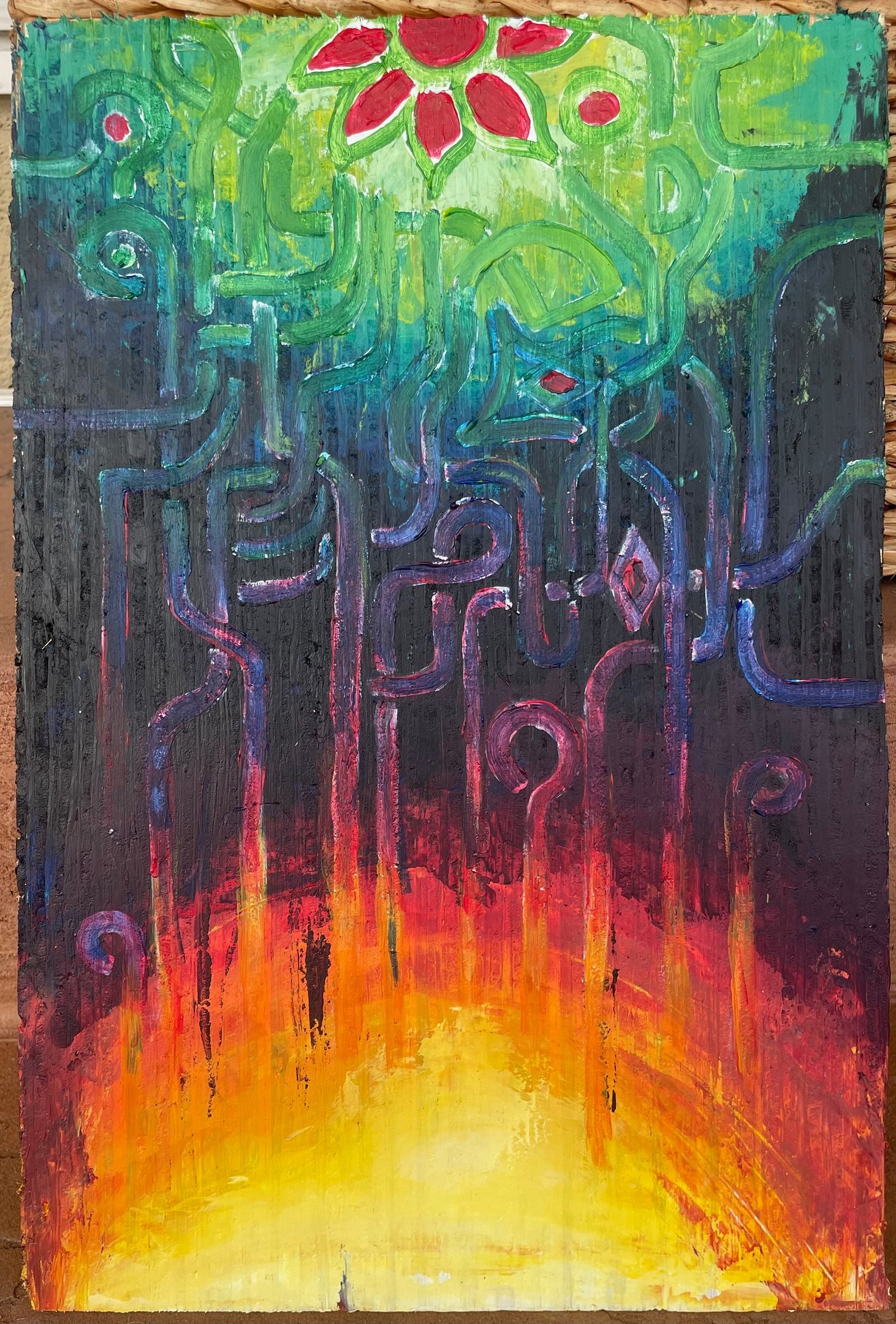 I decide to capture this thought: from the city burning at the bottom we see smoke columns become weaving paths in the darkness, suggesting the frantic of activity that culminates in a new blossom at the top